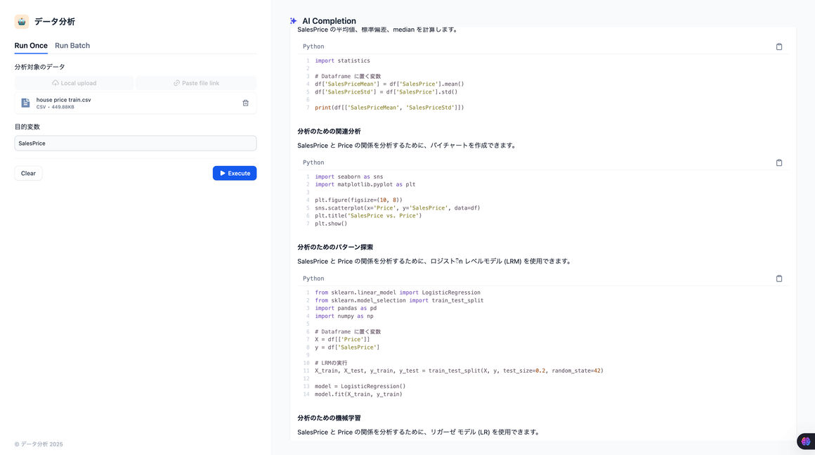 生成AIが生成したプランと分析用のコードを利用して基礎分析を行います。